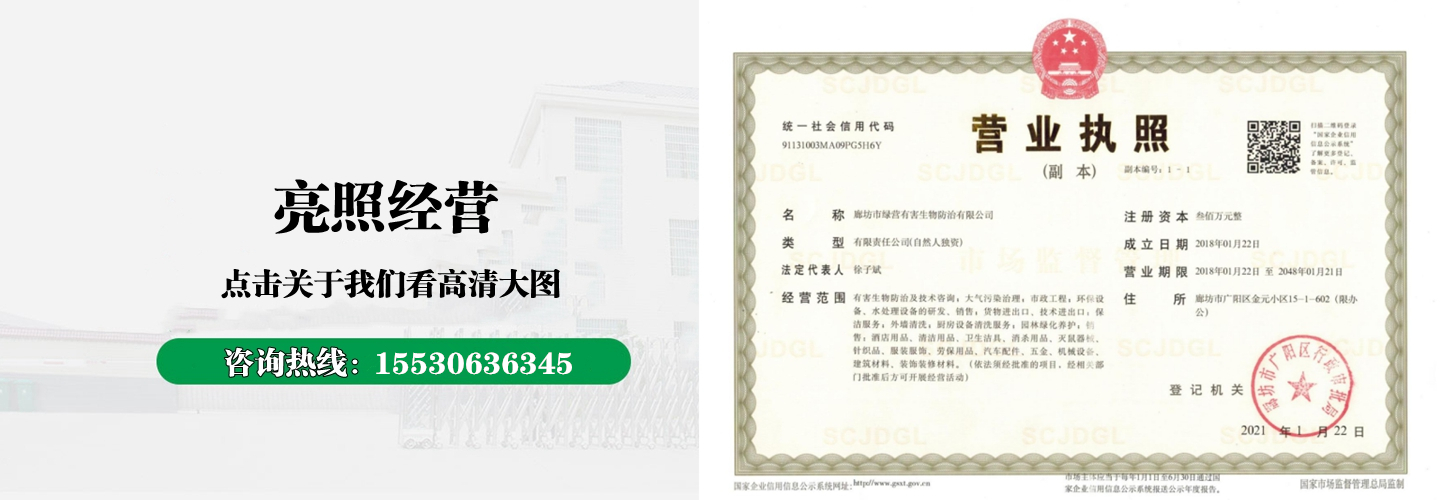 廊坊市綠營(yíng)有害生物防治有限公司主要從事有害生物防治及環(huán)境消毒服務(wù),專(zhuān)注于白蟻預(yù)防工程、滅白蟻、滅老鼠、滅蟑螂、滅蚊蠅、滅跳蚤、滅臭蟲(chóng)、滅紅火蟻、滅塵螨、消毒滅菌、家居清潔等有害生物的預(yù)防和治理服務(wù)。本公司面向,公共場(chǎng)所、商務(wù)樓、商場(chǎng)、超市、公園、工廠(chǎng)、酒店、餐廳、浴場(chǎng)、私人住宅等各類(lèi)環(huán)境,公司一直堅(jiān)持以健康環(huán)保為前提,讓我們多一份健康”為宗旨,結(jié)合安全、、無(wú)反彈、對(duì)人畜安全無(wú)害,解決您的后顧之憂(yōu),與您共同打造一個(gè)無(wú)害、潔凈、舒適、健康的生活環(huán)境。...
